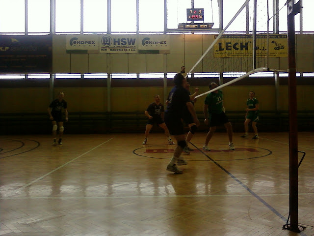 Gdy przyszliśmy, okazało się iż jest drobne przesunięcie w czasie z meczami i właśnie trwał pojedynek Zakładu Drzewnego Domostawa z MONTAN Stal, a na tablicy wyników widniało 1:1 w setach. Co więc można powiedzieć o tym meczu - odnosi się wrażenie, że zespól z Domostawy bardzo się poprawił. Pokazali dziś kilka ciekawych zagrań i pomysłowo prowadzili grę. Brakowało im jednak czasem dokładności i zwyczajnego szczęścia. Ono z kolei dziś sprzyjało drużynie MONTANu. Ostatecznie to właśnie MONTAN po zaciętej walce zwyciężył 3:1. (w setach: 25:12, 24:26, 25:18, 25:22).